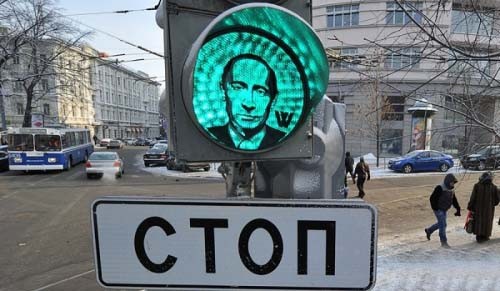 2012年2月13日,俄羅斯莫斯科街頭現(xiàn)“普京版交通信號燈”,支持者希望群眾為普京“亮起綠燈”。