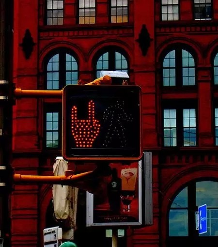 后現(xiàn)代藝術(shù)家設(shè)計(jì)的交通信號燈,綠色樹葉不僅是前進(jìn)的意思,而且在這個(gè)圖示中還有一個(gè)誘惑性的字母A,含義極為深刻,引人深思。